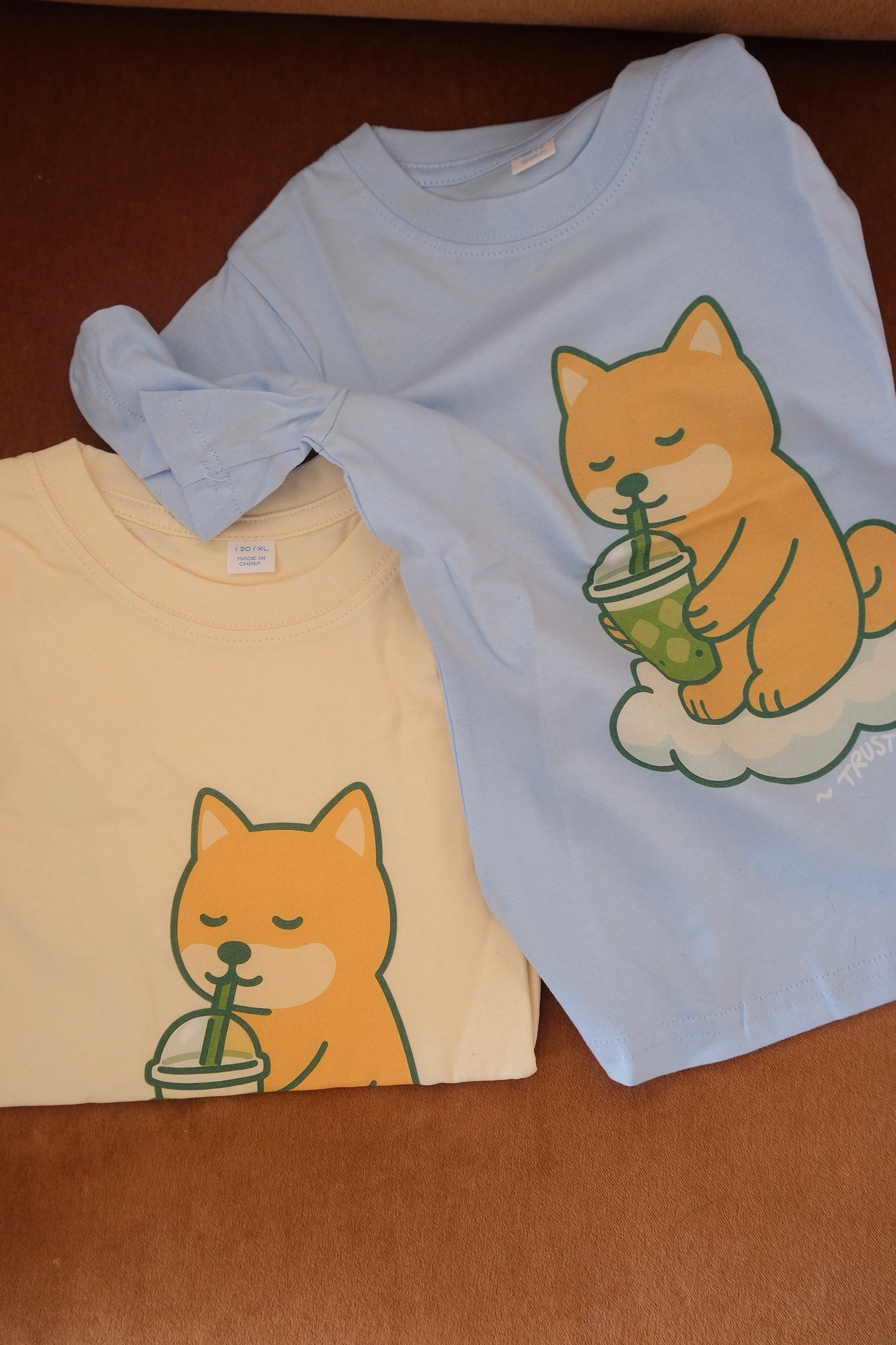 Our KIDS Ponta iced matcha latte tee shirt. Made with 100% organic cotton, this tee comes in yellow and blue and features a playful matcha latte drinking Ponta print on the front.